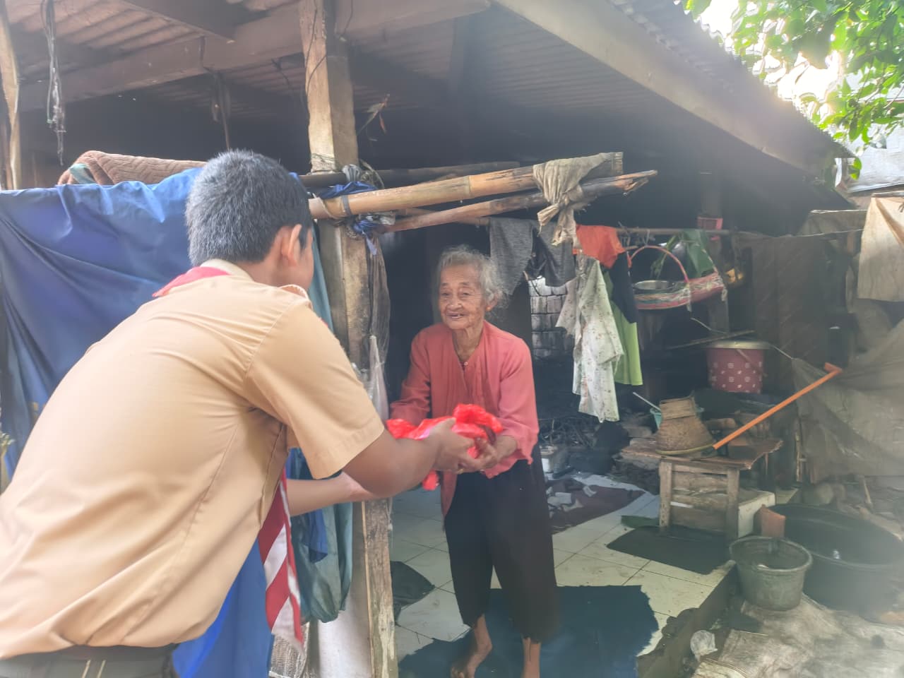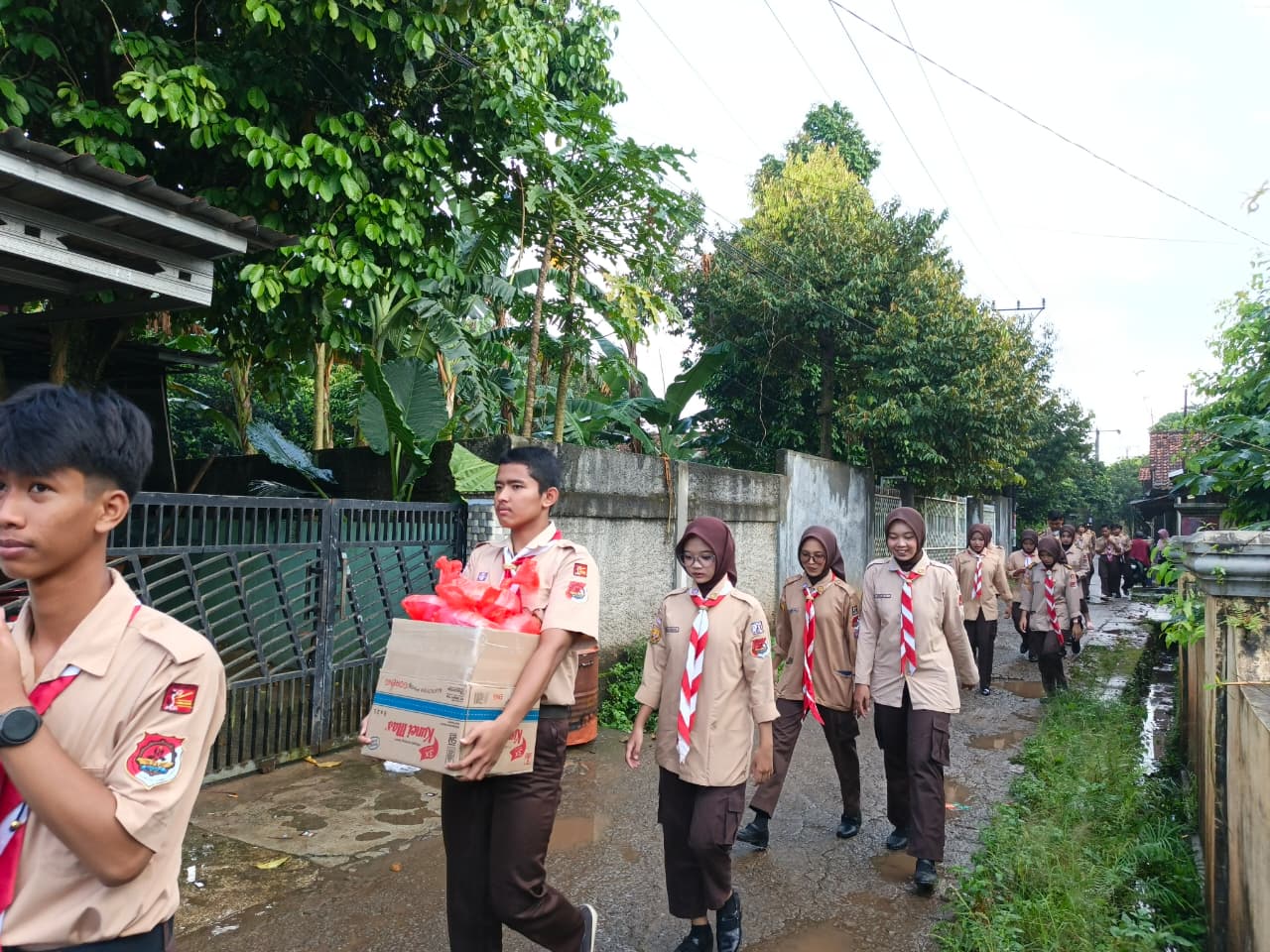 Melalui kegiatan rantang Pramuka, para anggota Pramuka SMK PGRI Karisma Bangsa membagikan sebanyak 60 paket makanan kepada masyarakat yang membutuhkan di sekitar Desa Gandoang